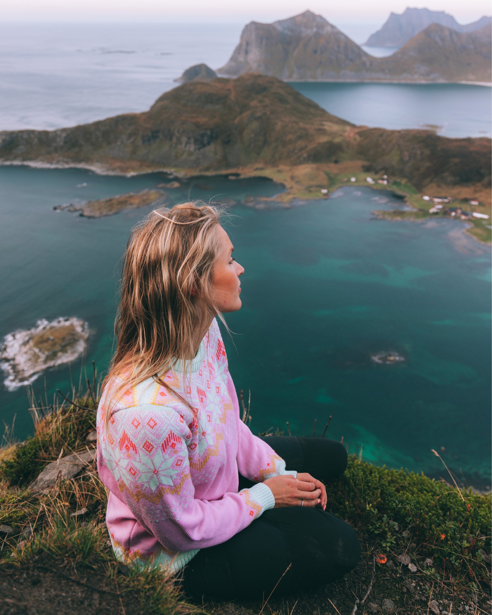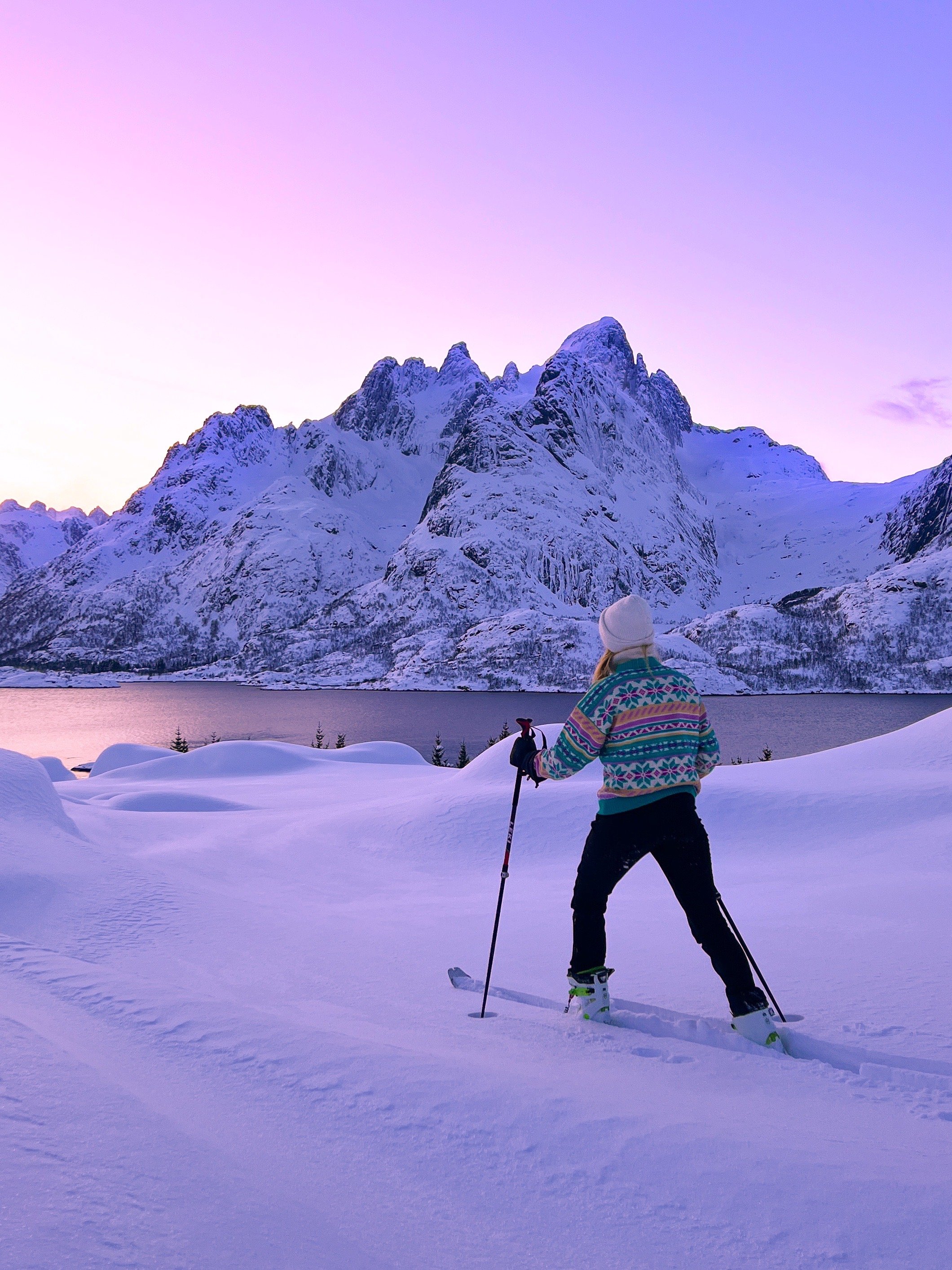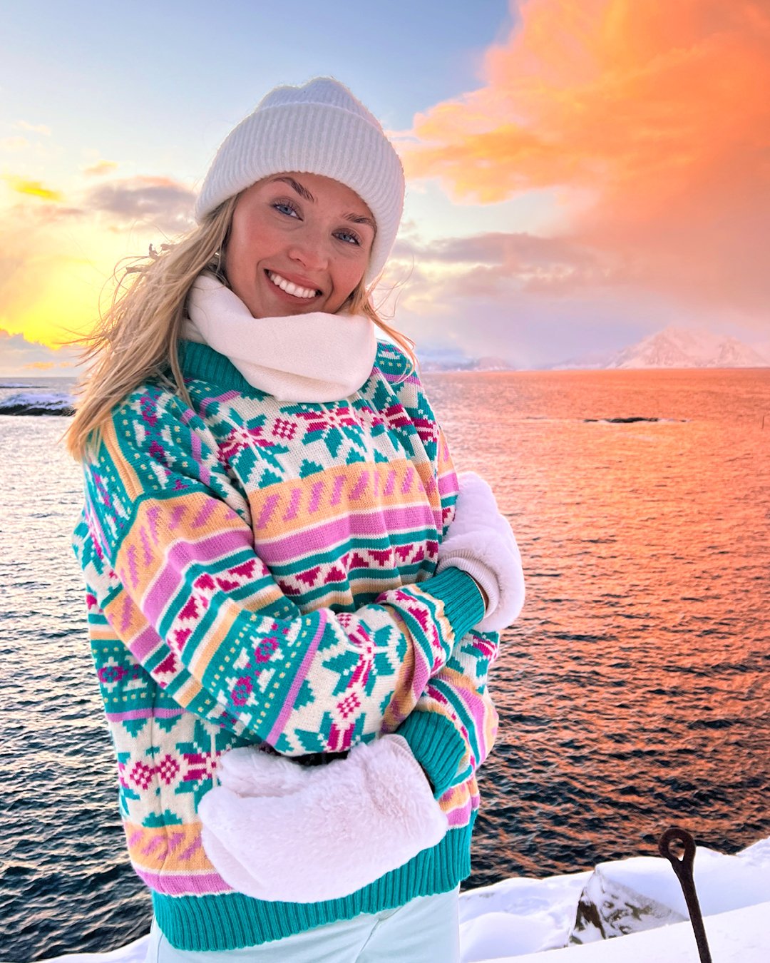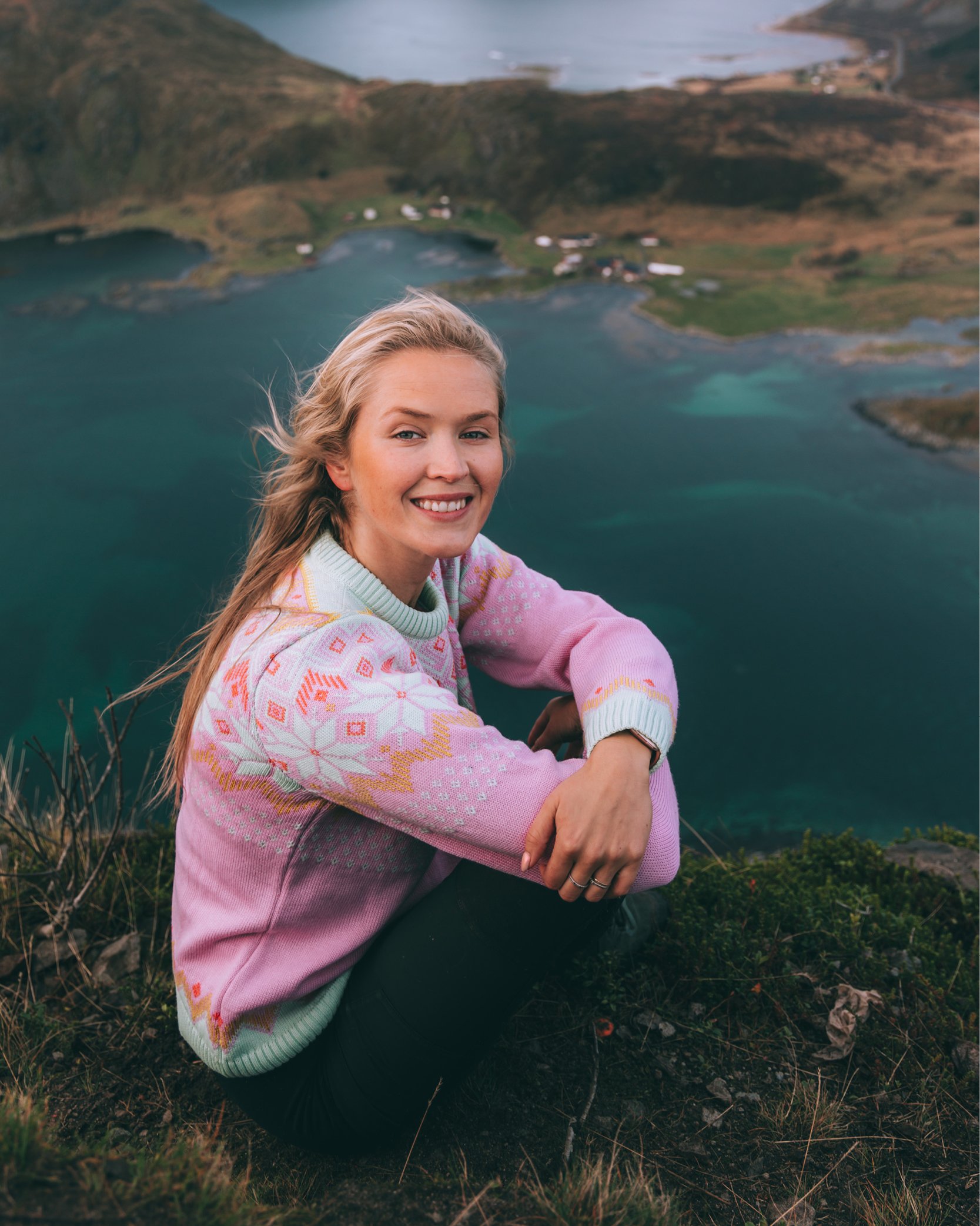 Interessen for strikkegensere oppsto da Ingrid flyttet til Lofoten i 2017. “Jeg merket fort at både stilen og behovet for ull og strikk her i nord var større enn i Oslo. I Lofoten begynte jeg å kle meg mer praktisk, og etterhvert som tiden gikk begynte jeg å gå med strikkegensere daglig”, forteller den fargeglade jenta.