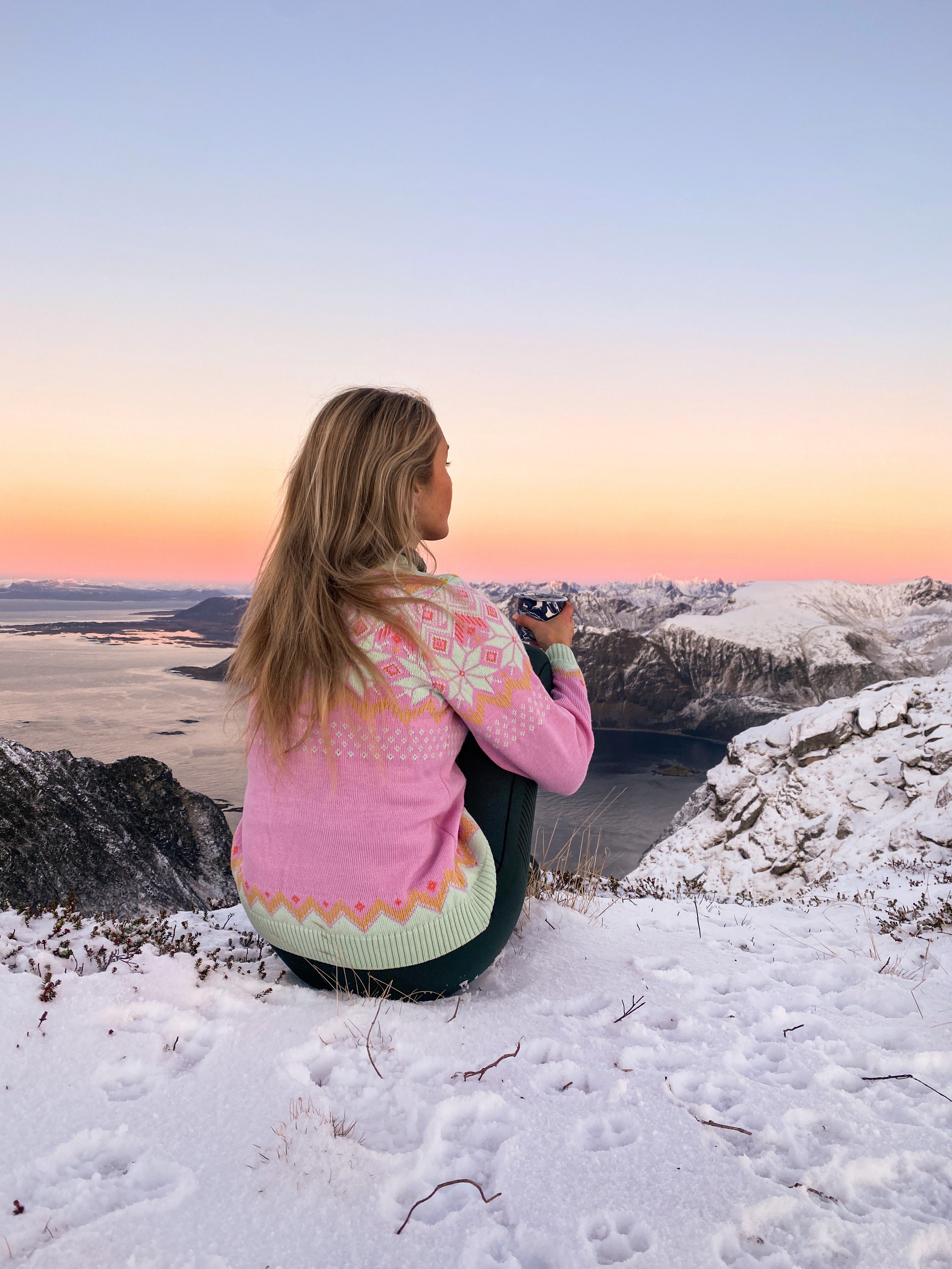 Nå lanserer Dale of Norway og Ingrid Raadim Hennig en ny, fargerik, Ingrid-genser! Dette er den tredje genseren i rekken fra samarbeidet, og nok en gang har Ingrid designet en genser som fanger essensen av nord. Inspirert av de magiske solnedgangene i Lofoten, gjenspeiler fargepaletten en vakker blanding av rosa, lilla og hint av gul – en hyllest til det spektakulære lyset Ingrid elsker.