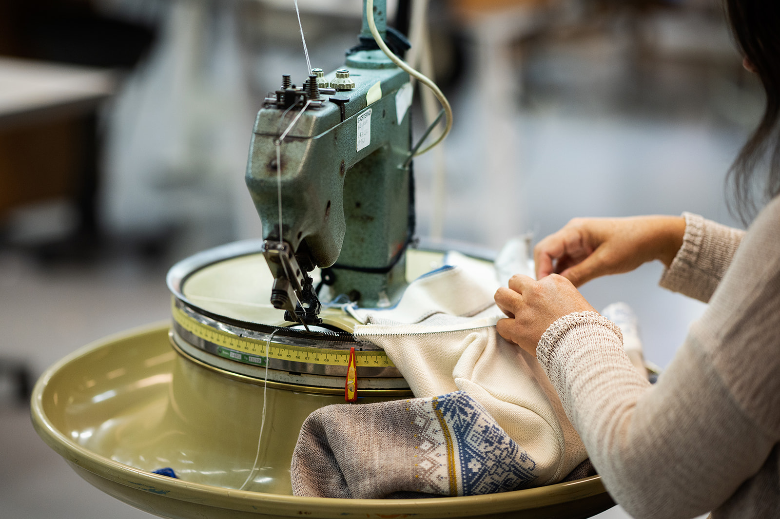 Ved siden av produktutvikling tar også avdelingen del i sømming av de ferdige produktene du kjøper hos oss, det vil si at de syr sammen de ulike strikkede delene til hele plagg og monterer glidelåser og knapper.