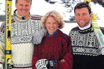 Bildet viser de norske langrennsutøverne Vegard Ulvang, Marit Wold og Thomas Alsgaard i den offisielle VM-genseren.