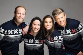 Bildet: Martin Johnsrud Sundby, Marit Bjørgen, Heidi Weng og Johannes Høsflot Klæbo i den offisielle OL-genseren.